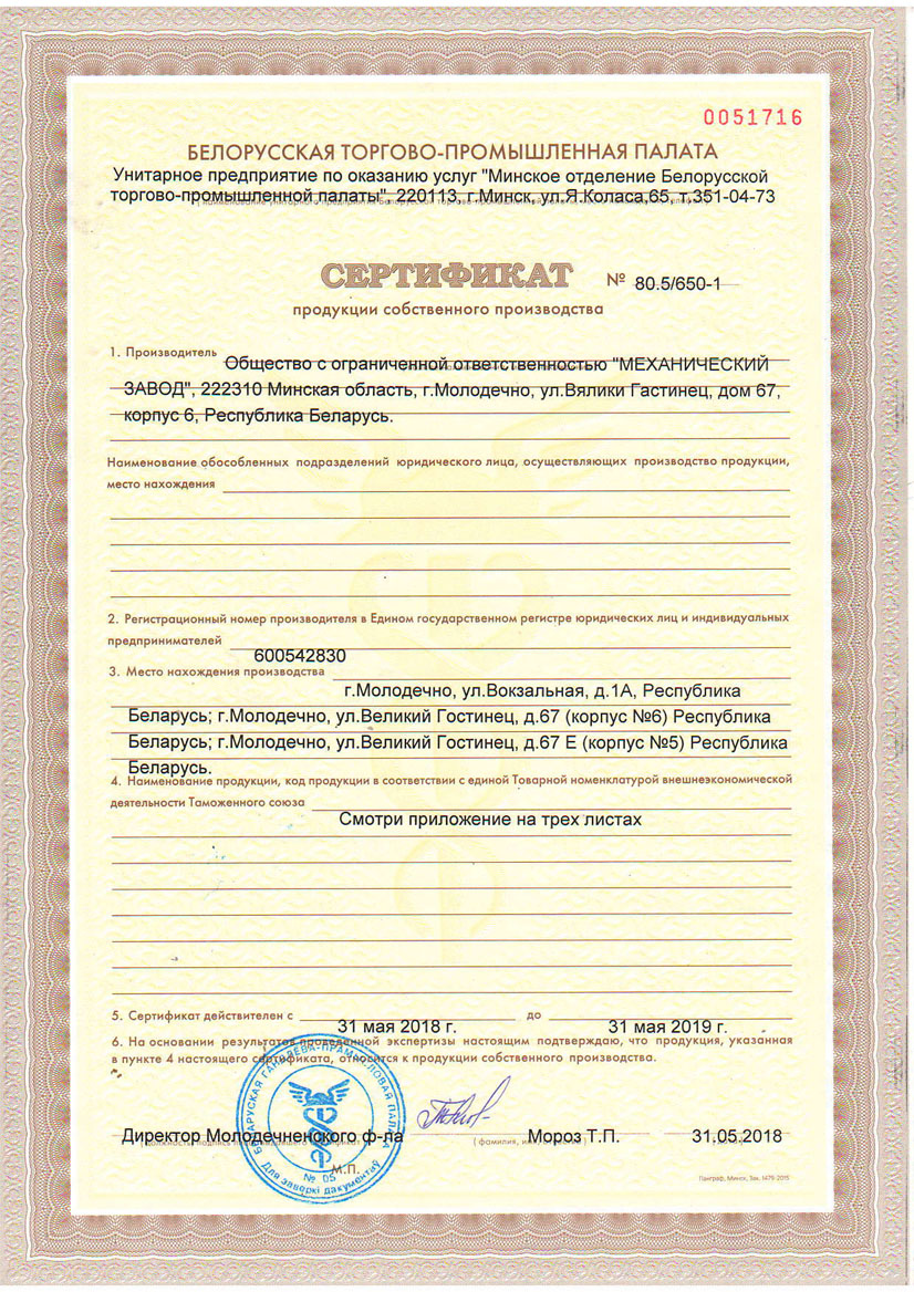 Сертификаты Приложение к сертификату на продукцию собственного производства 1 Сертификат соответствия Таможенного союза на тележки к мотоблокам типа ТМ Приложение к сертификату на продукцию собственного производства 2 Приложение к сертификату на продукцию собственного производства 3 Приложение к свидетельству на товарный знак Свидетельство на товарный знак Сертификат соответствия на бороны для мотоблоков бороны типа БР 1 Сертификат соответствия на окучники для мотоблоков окучник регулируемый ОР Сертификат соответствия на плуги для мотоблока плуги типа П1, П2, П3 Свидетельство о государственной регистрации Сертификат соответствия на картофелекопалку для мотоблоков, модели КМ. Серийный выпуск. О принадлежности к объектам обязательного подтверждения соответствия продукции "Адаптер для мотоблоков модели АМ" Сертификат соответствия на картофелесажалку модели КСМ Свидетельство о технической компетентности 1 Свидетельство о технической компетентности 2 Сертификат соответствия на мотокультиватор модели МК9 Сертификат на продукцию собственного производства